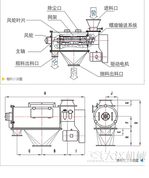 氣旋篩由振動(dòng)電機(jī)、機(jī)座、篩箱、進(jìn)出料推進(jìn)裝置等組成。本機(jī)篩網(wǎng)為圓筒狀分布在機(jī)體內(nèi),物料由料斗經(jīng)螺旋輸送進(jìn)入篩箱,風(fēng)輪葉片連續(xù)轉(zhuǎn)動(dòng),對(duì)所篩選物料在篩箱內(nèi)不斷的更新推進(jìn),使物料產(chǎn)生運(yùn)動(dòng)沖向篩網(wǎng),過(guò)網(wǎng)物料從細(xì)料排出口排出,粗料則繼續(xù)向前從粗料排出口排出。