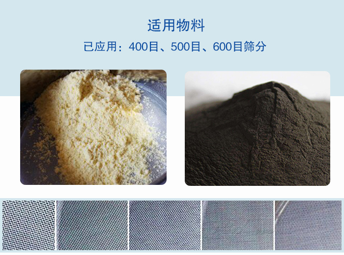 已應用:400目、500目、600目篩分碳化硅、合金粉末、鉬粉、不銹鋼粉、鎢粉、鎳粉、鈷粉、粉末涂料、石英粉、丁米酮粉、麥芽粉、病毒唑、咖啡粉、電磁粉、負極材料、激光粉。