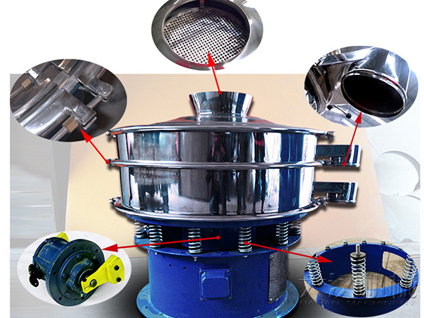 旋振篩主要由進(jìn)料口、防塵蓋、出料口、束環(huán)、篩網(wǎng)、配重塊、上部重錘、振動體、振動電機(jī)、彈簧、下部重錘、機(jī)座等部分組成。