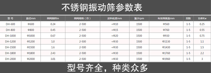不銹鋼直線振動(dòng)篩是在碳鋼直線振動(dòng)篩的基礎(chǔ)上采用了不銹鋼材質(zhì),但是也是有所差異的,大漢的不銹鋼直線振動(dòng)篩不只有半不銹鋼材質(zhì)的,還有全不銹鋼材質(zhì)的,型號種類非常齊全,具體參數(shù)詳見上圖參數(shù)表。