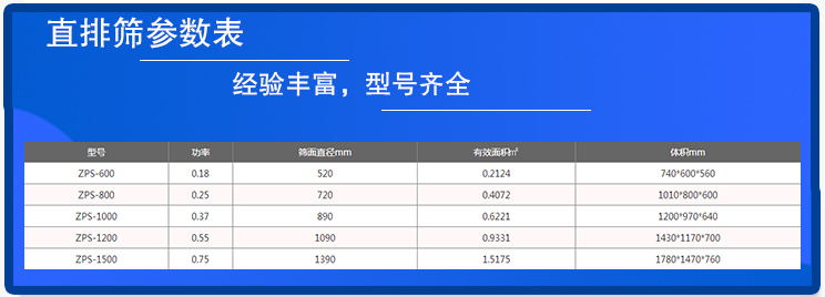 大漢自建廠已經經過了28個年頭,時間非常長,能夠生產的直排篩的型號一應俱全,可以滿足大多數客戶的需要,具體的直排篩參數如上表所示。