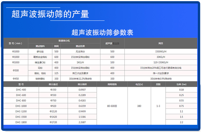 超聲波振動篩價格差異大的一大因素就是因為產量的差異非常大,產量越高,篩分的物料就越多,帶來的經濟效益就越多,價格就越高。具體的參數如上圖所示。
