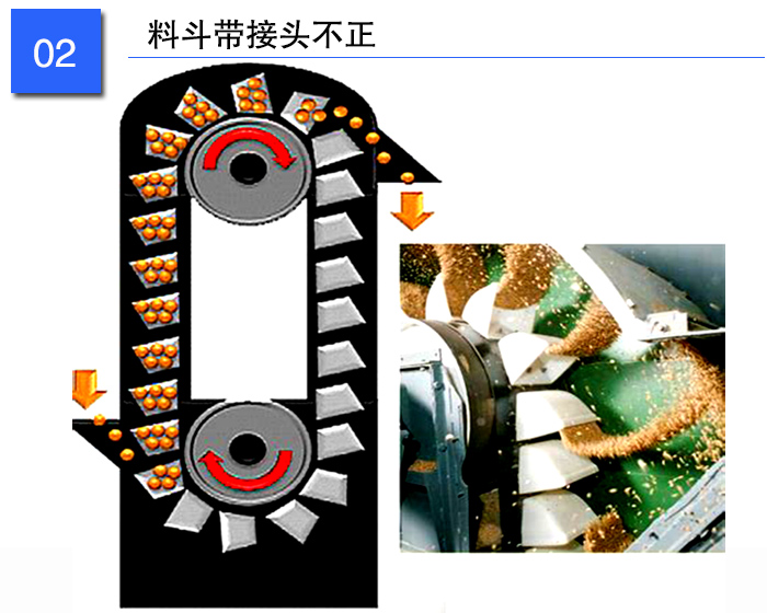 料斗帶接頭不正是指料斗帶結合后,料斗帶邊緣線不在同一直線上。工作時,料斗帶一邊緊一邊松,使料斗帶向緊邊側向移動,產生跑偏,造成料斗盛料不充分,卸料不,回料增多,生產率下降,嚴重時造成料斗帶卡邊、撕裂。