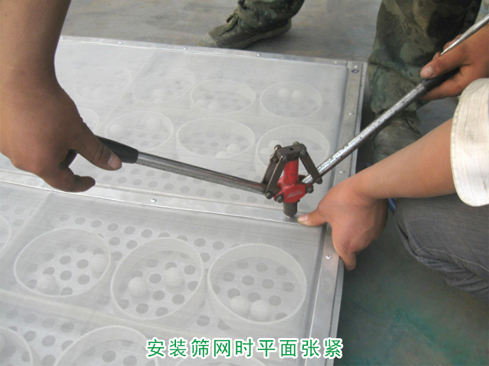 解決方案:在安裝或更換篩網(wǎng)時,應3-4人同時作業(yè),將篩網(wǎng)平鋪在篩網(wǎng)架上,然后放上篩網(wǎng)壓緊圈,按照篩網(wǎng)的垂直方向用螺釘對稱稍作固定,在篩網(wǎng)無折、松緊均勻后分別將螺釘穿入螺孔中,慢慢逐個均勻輪換擰緊。