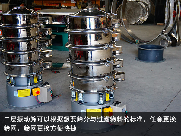 不銹鋼旋振篩是在碳鋼旋振篩基礎上,設計出的具有國內先進水平的振動篩分設備,用于篩分對材質有特殊要求的物料。二層振動篩與不銹鋼旋振篩是同一種產品不過有兩種叫法,此篩機是采用新型YZUL系列單法蘭振動電機,具有穩定的激振力。這款振動篩可以篩分各種物料具有篩分特殊性、高粘度、細粒物料、細粉、微粉、及干、濕物料等多種物料,是篩分行業的好幫手。二層振動篩可以根據想要篩分與過濾物料的標準,任意更換篩網,篩網更換方便快捷。