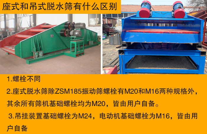 座式脫水篩除ZSM185振動(dòng)篩螺栓有M20和M16兩種規(guī)格外,其余所有篩機(jī)基礎(chǔ)螺栓均為M20,皆由用戶自備。