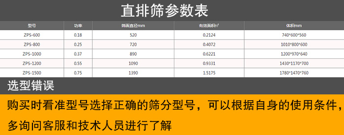 用戶在選用型號時應根據實際產量、顆粒大小不同選擇合適的機型,比如:比重為每立方1噸的物料選擇目數為50目的篩網,采用ZPS-1000型直排篩,則生產量大概在1.5t/h,用戶要有一個大概的了解,避免選型錯誤造成效率低下。